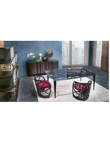 Tavolo fisso rettangolare. Struttura in essenza di rovere disponibile nella finitura naturale o con finitura ardesia. Struttura delle gambe in massello di acero con profili in noce. Piano in vetro trasparente.