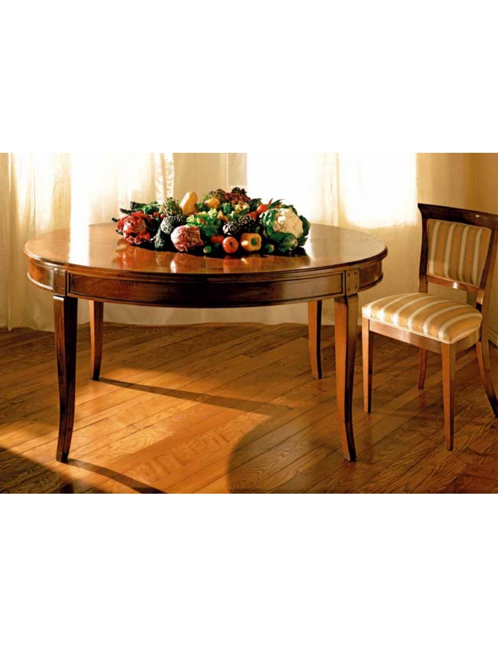 Tavolo ovale allungabile in noce nazionale massello, disponibile con le cinture lisce o scanalate. Fascia esterna sul piano con filetto e legno di testa con 3 prolunghe lastronate di cm 36, di cui 1 con cinture laterali pieghevoli e contenute tutte internamente.