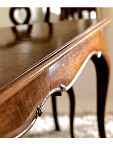 Tavolo rettangolare allungabile con piano in noce nazionale intarsiato con legni di bosso e ulivo. Il tutto di mm4 di spessore, con 2 prolunghe di cm 50 cad. contenute internamente.