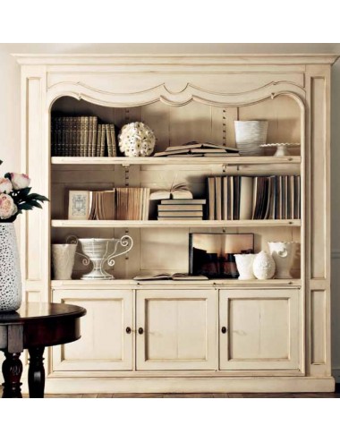 Libreria con parte alta a giorno, 3 ante basse con ripiano estraibile.