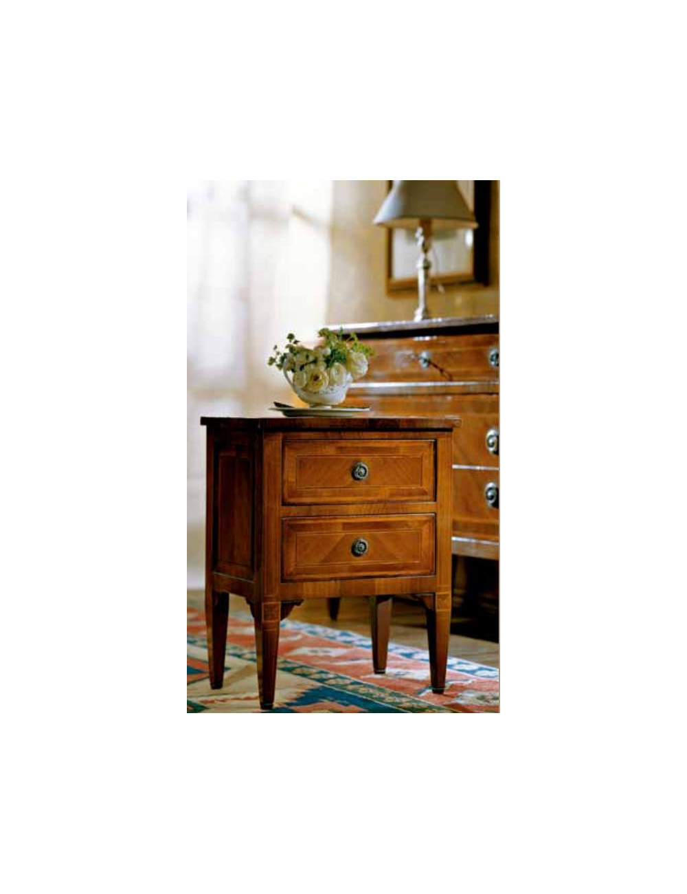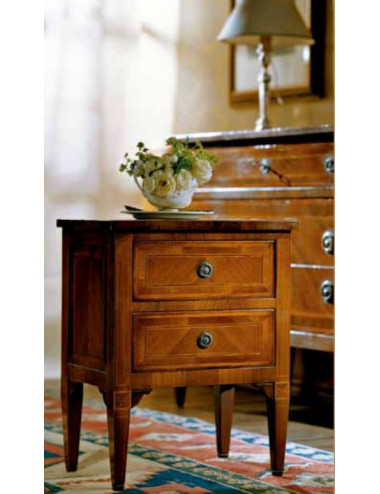 Comodino 2 cassetti "700" italiano, spinato con filettatura in legno di bosso sul noce massello.