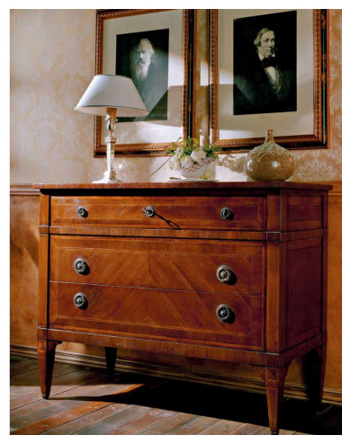 Questa produzione rappresenta “la nostra punta di diamante”. A differenza delle altre, viene creata direttamente dall'originale, utilizzando le antiche tecniche dei maestri ebanisti, nel rispetto delle tradizioni artistiche che rendono unico ogni oggetto. La costruzione e la finitura di ciascun prodotto sono realizzate avvalendosi di materie prime selezionate, lavorate con la massima accuratezza esclusivamente da artigiani qualificati. Una collezione che racconta nei dettagli la propria storia, testimonianza di un lavoro artistico e non di serie. Tutti gli incastri vengono eseguiti rigorosamente rispettando le caratteristiche del pezzo di origine o a coda di rondine unica o a coda di rondine folta a secondo dell'epoca di riferimento: '600, '700,'800. I chiodi in legno presenti e utilizzati come fermi, sono tutti passanti come gli stessi intarsi, inseriti o direttamente sul massello oppure sulla lastronatura di noce o ulivo. Gli intarsi hanno uno spessore di 0,4 o 0,5 mm a secondo dell'originale. Gli interni dei cassetti, del fondo posteriore e dei ripiani interni non a vista, vengono realizzati in frassino. I pannelli posteriori in frassino possono essere in alcuni modelli, con bugnatura ad incastro senza ausilio di collante. Le viti, vengono inserite con una speciale taglio del legno, per dare modo al pannello in massello, di potersi restringere o allargarsi secondo l'esigenze naturali del legno. Lucidatura a gommalacca oppure a gommalacca e cera d'api.