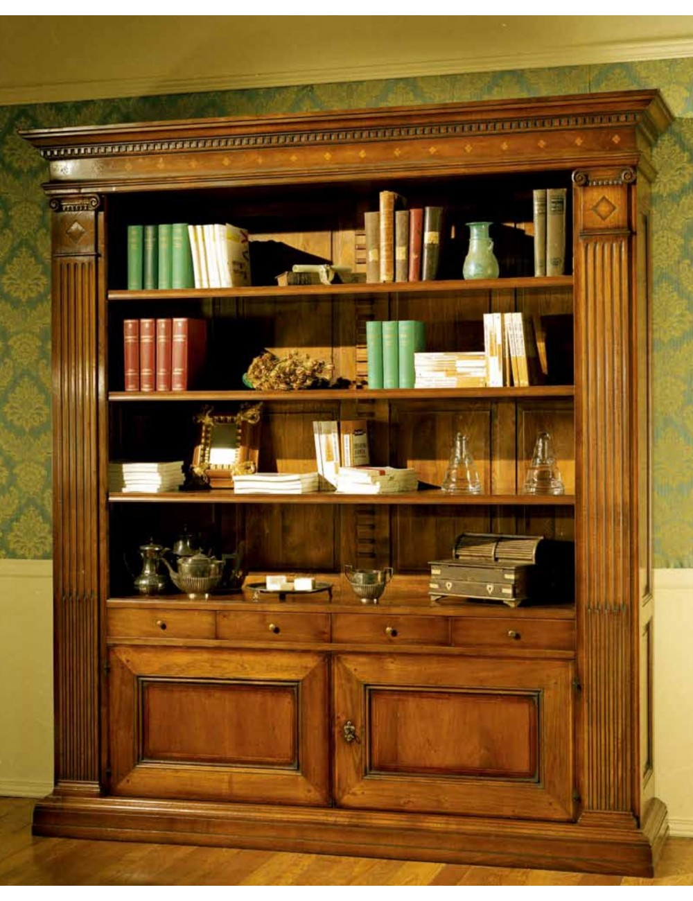 Libreria con parte alta a giorno con 2 ante chiuse nella parte inferiore, 4 cassetti e capitelli intagliati. Tutta in noce nazionale.