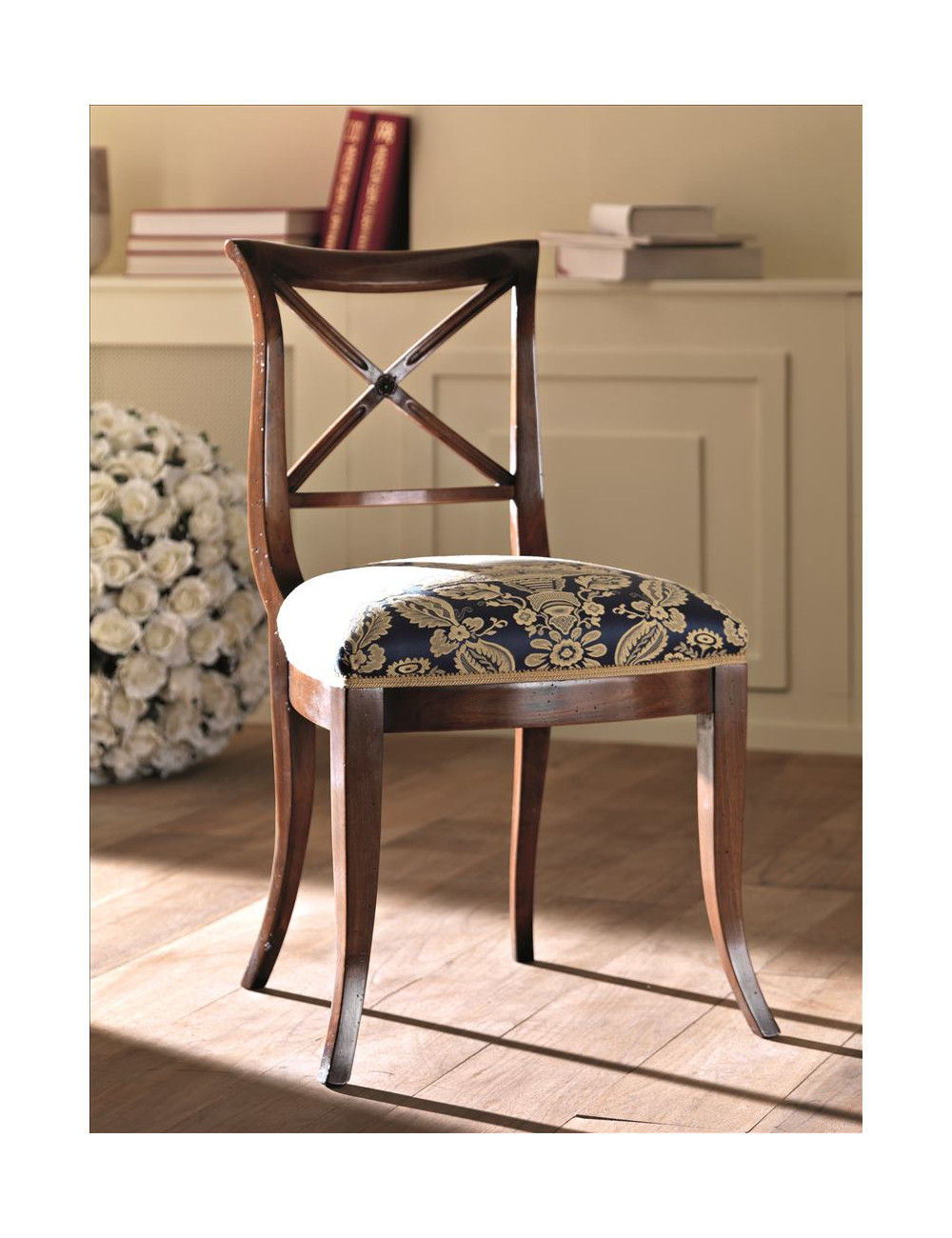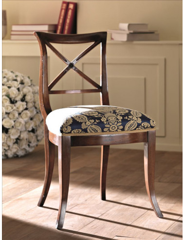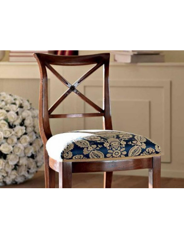 Sedia con unica croce inserita nella spalliera tutta in noce nazionale massello rivestita in stoffa.
