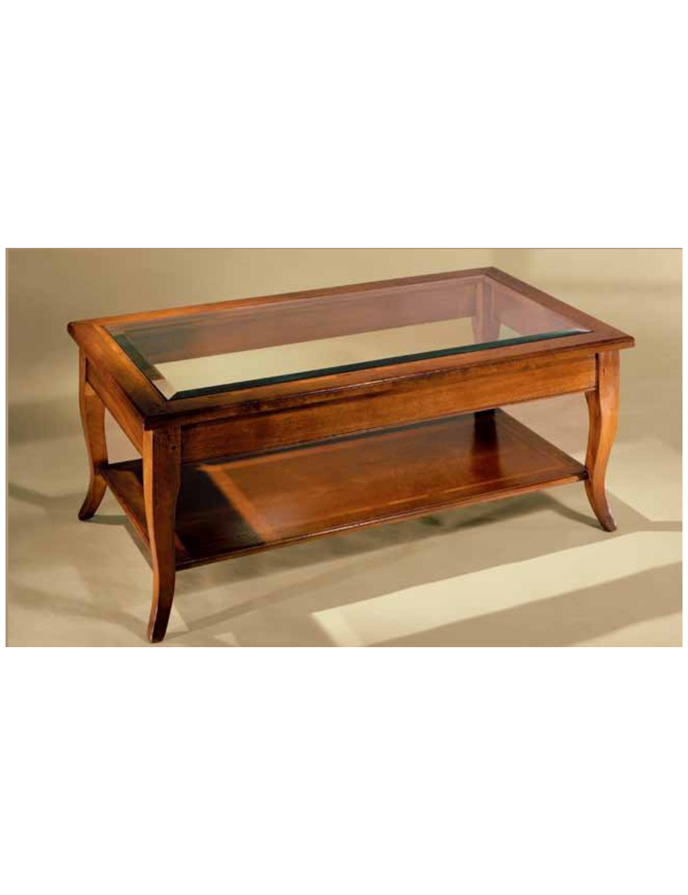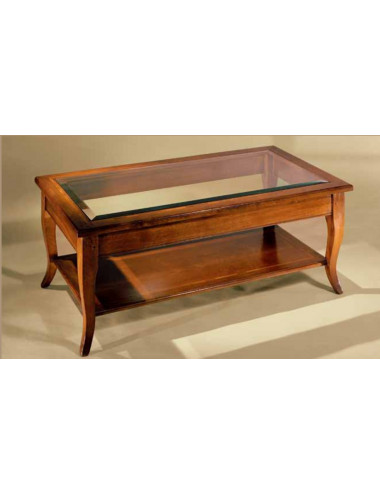 Tavolino rettangolare in noce nazionale massello con ripiano basso in noce e piano principale in cristallo molato.