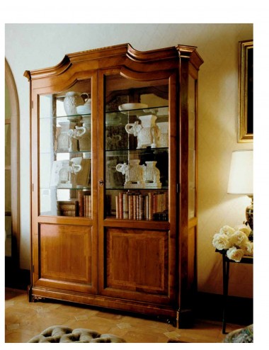 Vetrina 2 ante sagomate, con vetro soffiato a bocca, filettatura in legno di bosso e olivo con lavorazione a spina pesce sul noce massello. Ripiani regolabili interni in cristallo.