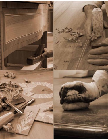 Questa produzione rappresenta “la nostra punta di diamante”. A differenza delle altre, viene creata direttamente dall'originale, utilizzando le antiche tecniche dei maestri ebanisti, nel rispetto delle tradizioni artistiche che rendono unico ogni oggetto. La costruzione e la finitura di ciascun prodotto sono realizzate avvalendosi di materie prime selezionate, lavorate con la massima accuratezza esclusivamente da artigiani qualificati. Una collezione che racconta nei dettagli la propria storia, testimonianza di un lavoro artistico e non di serie. Tutti gli incastri vengono eseguiti rigorosamente rispettando le caratteristiche del pezzo di origine o a coda di rondine unica o a coda di rondine folta a secondo dell'epoca di riferimento: '600, '700,'800. I chiodi in legno presenti e utilizzati come fermi, sono tutti passanti come gli stessi intarsi, inseriti o direttamente sul massello oppure sulla lastronatura di noce o ulivo. Gli intarsi hanno uno spessore di 0,4 o 0,5 mm a secondo dell'originale. Gli interni dei cassetti, del fondo posteriore e dei ripiani interni non a vista, vengono realizzati in frassino. I pannelli posteriori in frassino possono essere in alcuni modelli, con bugnatura ad incastro senza ausilio di collante. Le viti, vengono inserite con una speciale taglio del legno, per dare modo al pannello in massello, di potersi restringere o allargarsi secondo l'esigenze naturali del legno. Lucidatura a gommalacca oppure a gommalacca e cera d'api.