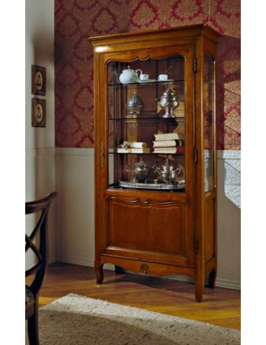 Vetrina-argentiera provenzale con vetro soffiato a bocca, completamente in noce nazionale massello, con piedi ricavati dai montanti laterali.