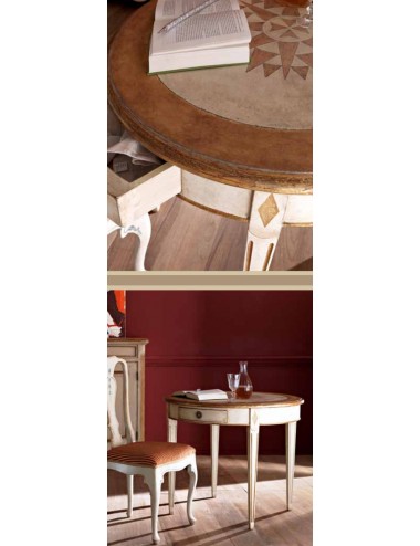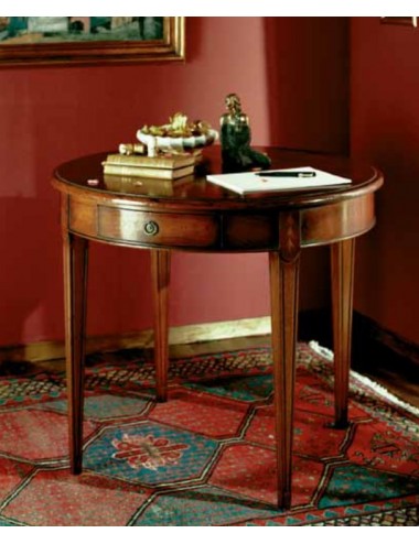 Tavolino rotondo con cassetto e stella intarsiata sul noce nazionale massello e intarsio passante di 4mm sulle gambe.