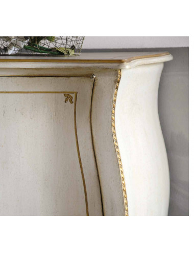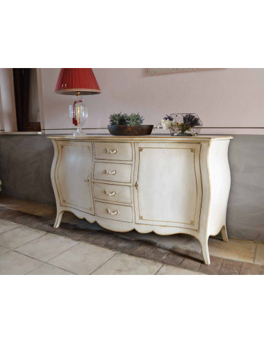 Credenza bombata con 2 porte e 4 cassetti, con finitura bianco antico.