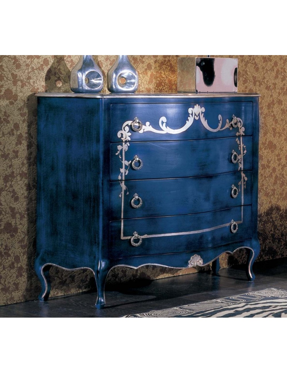 Comò provenzale 4 cassetti finitura laccato blu con decoro in argento.