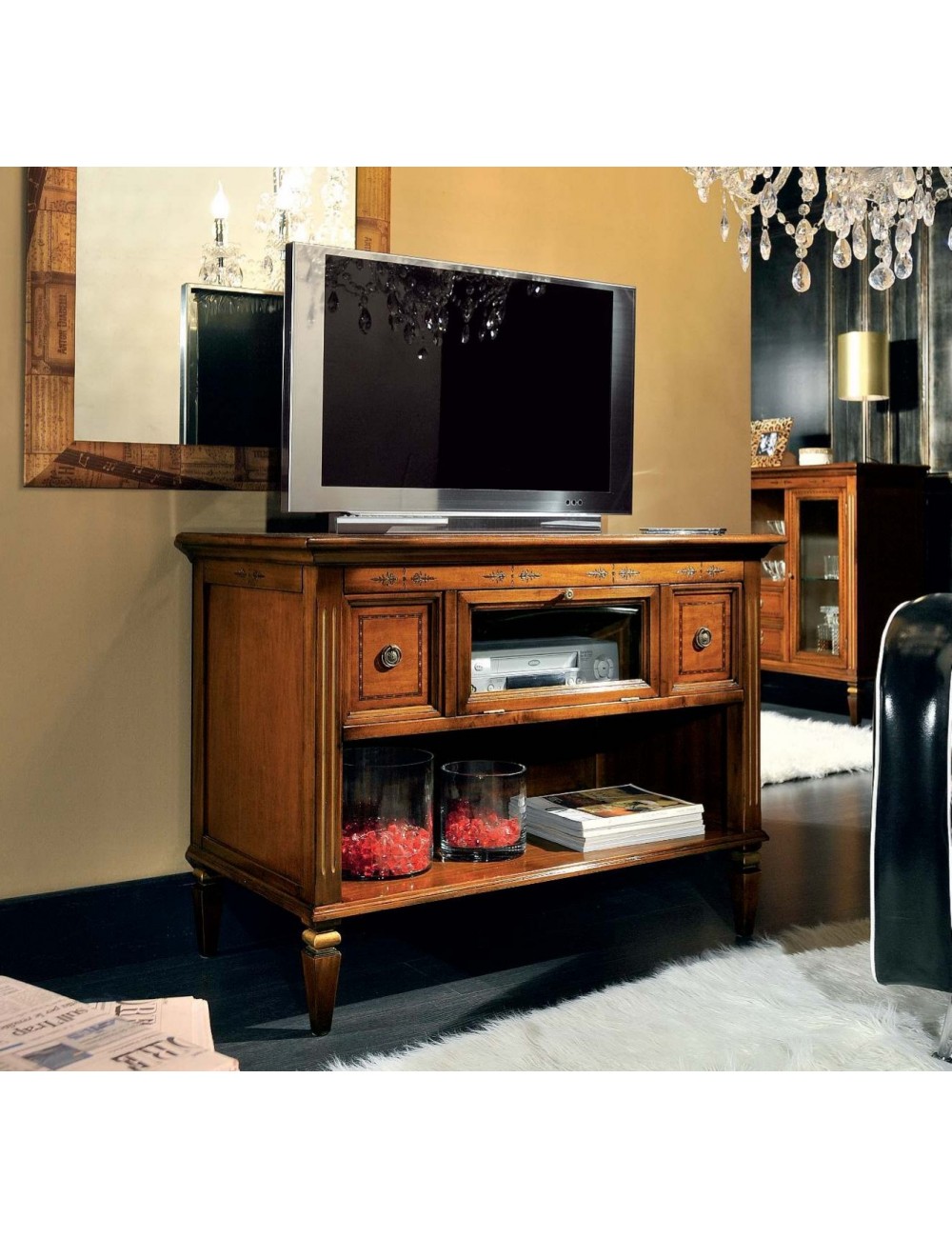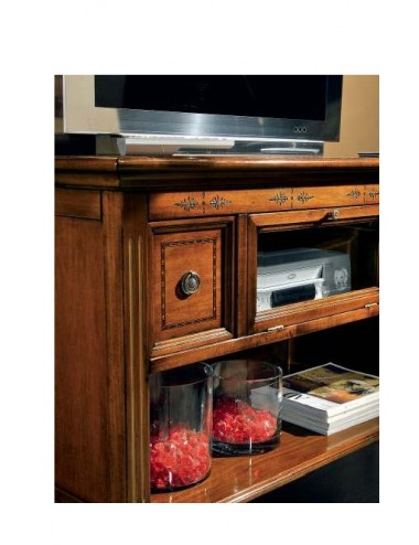 Porta tv 2 cassetti con ribalta, intagliata e filettata.