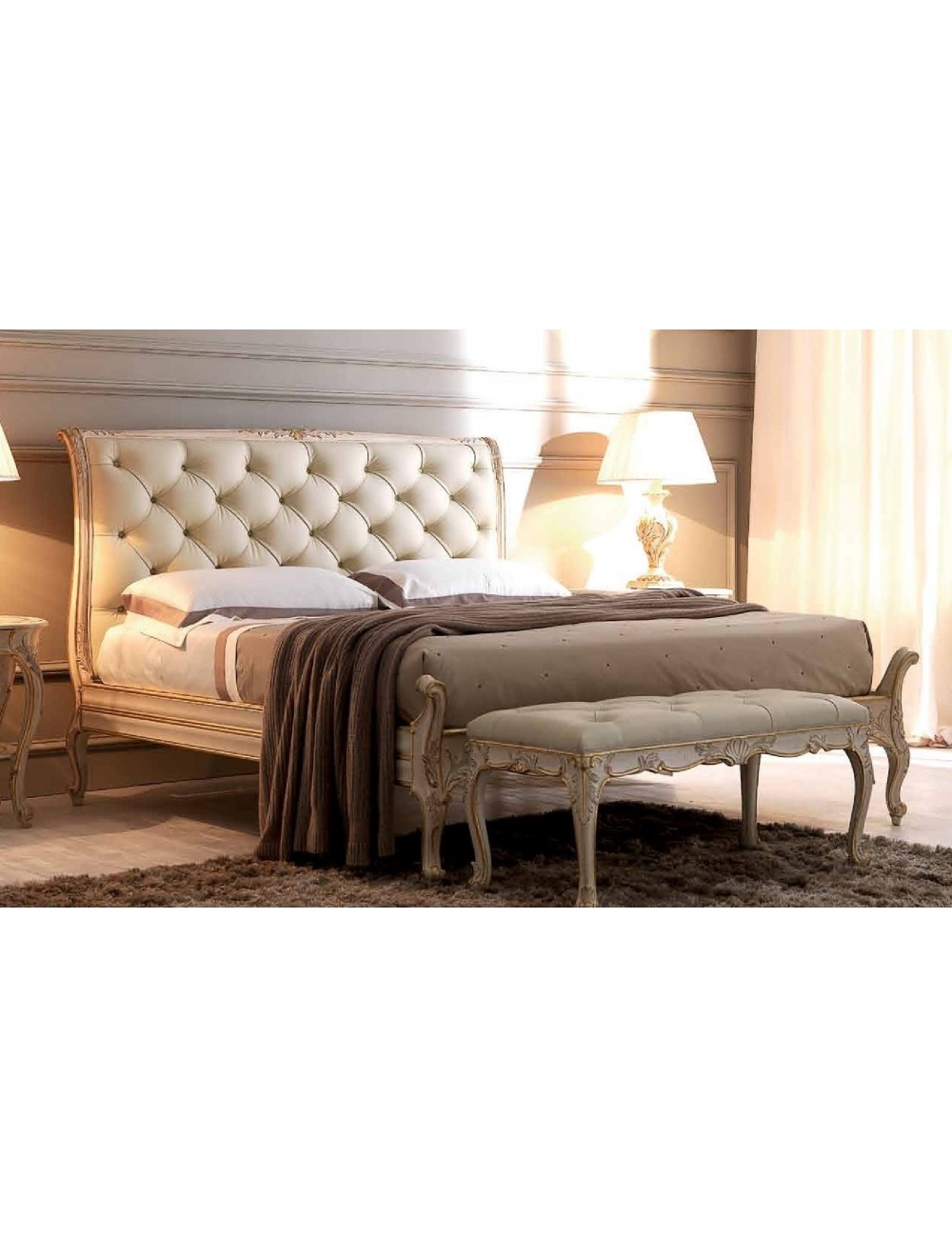 Il letto in foto viene realizzato in legno di tiglio finemente intagliato e decorato da maestri ebanisti.