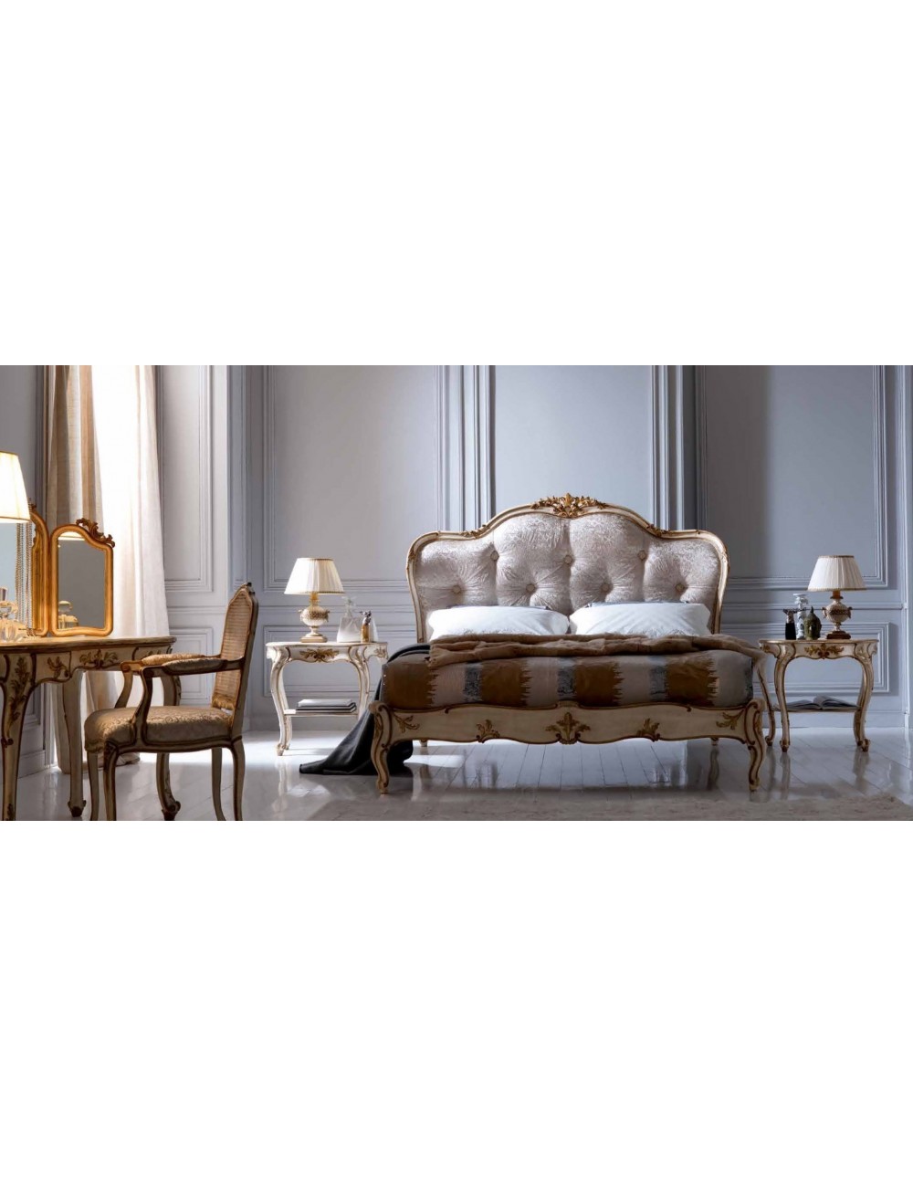Il letto in foto viene realizzato in legno di tiglio finemente intagliato e decorato da maestri ebanisti.