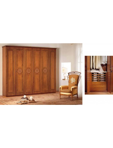 armadio con ante battenti caratterizzato da legni pregiati: la parte esterna delle ante è in ciliegio con ricca filettatura in legno di rose e zebrano. la parte centrale è invece in piuma di cerejeira con un importante ovale con intarsio a foglioline di diverse tonalità incastonate a mano singolarmente. l'interno si compone di cassetti, ripiani e vani a giorno: i frontali dei cassetti sono decorati con filetti e stellette intarsiate. con vano segreto.