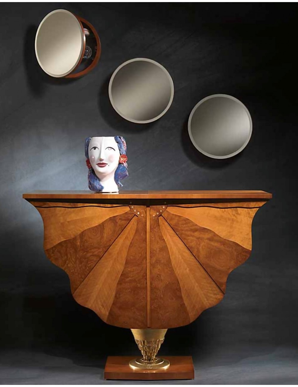 Struttura in massello sagomato. Le ali sono in radica e noce alternati tra loro con inserti in madreperla. Il basamento di sostegno è una scultura in fusione di ottone e rame. Con vano segreto.