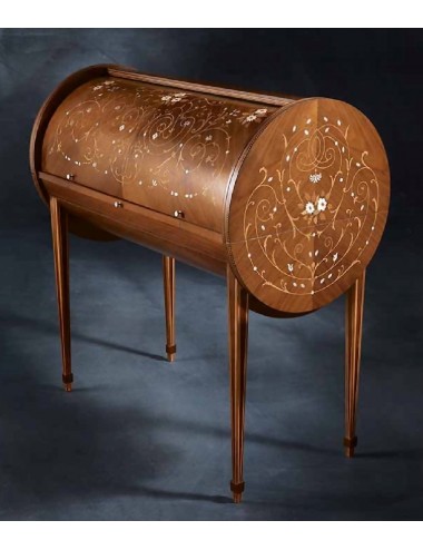 scrittoio tutto rivestito in noce con intarsi in diverse essenze pregiate. Le forme curve e i numerosi cassetti segreti ne fanno un gioiello in arte ebanista. E' illuminato da piccole madreperle.