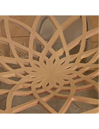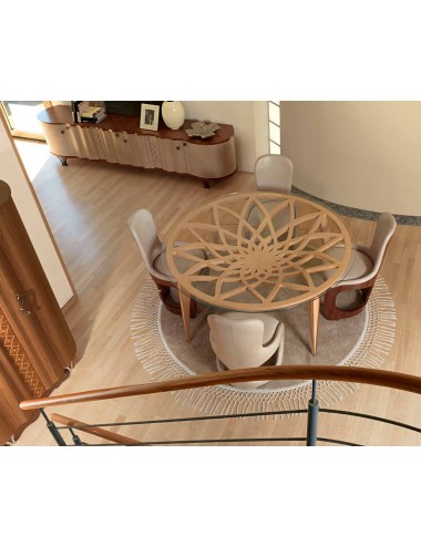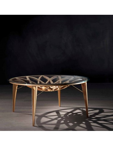 tavolo rotondo fisso disponibile con struttura in massello di rovere naturale, con finitura naturale oppure con finitura ardesia. I profili sulle gambe sono in massello di noce. La struttura delle gambe sono in massello di acero. Piano vetro trasparente.