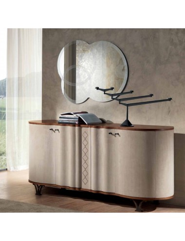 Credenza alta avente struttura in legno rivestita in pelle, piano in noce naturale, piedini in acciaio con finitura bronzo spazzolato, rivestimento in pelle nabuk e decorato con ricamo in cordonatura.