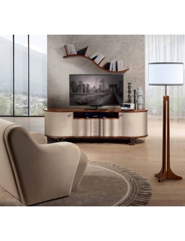 Mobile porta tv con struttura in legno rivestito in pelle. Piano in noce naturale, piedini e maniglie in acciaio con finitura bronzo spazzolato.