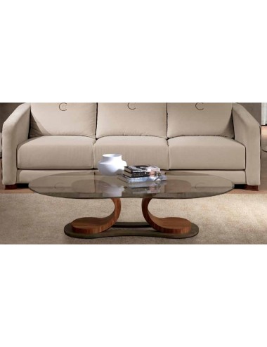 Tavolino ovale da salotto con struttura in noce naturale con intarsio, piano in vetro trasparente o trasparente bronzo, basamento in acciaio con finitura cromo oppure bronzo spazzolato. Decorato con intarsio in acero.