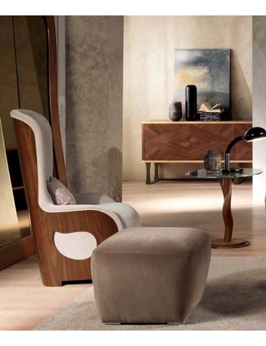 Poltrona con struttura del fusto in legno, scocca a vista in noce naturale e rivestita in tessuto e pelle.