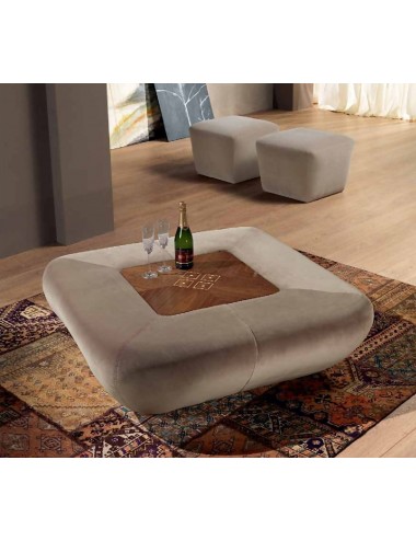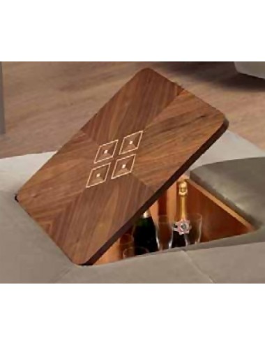 Pouf con contenitore bar: struttura del fusto in legno, piedini in gomma antiscivolo, piano in noce naturale con intarsio, rivestimento in tessuto e pelle.